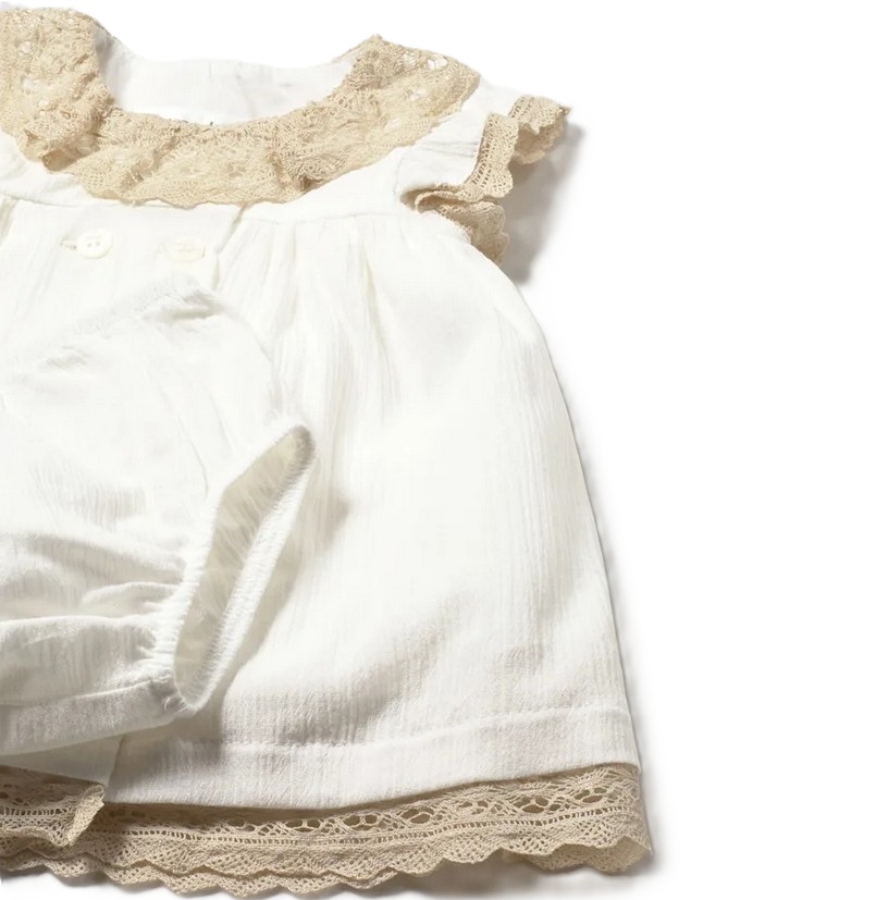 Vestito tinta unita con profili e colletto in pizzo a contrasto, coulotte in coordinato