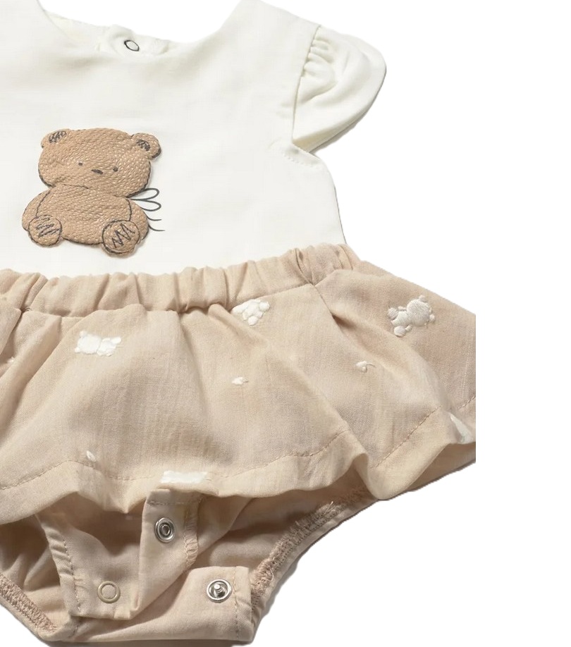 Completo composto da t-shirt tinta unita con stampa orsetto e coulotte tinta unita con volant e ricami orsetto a contrasto