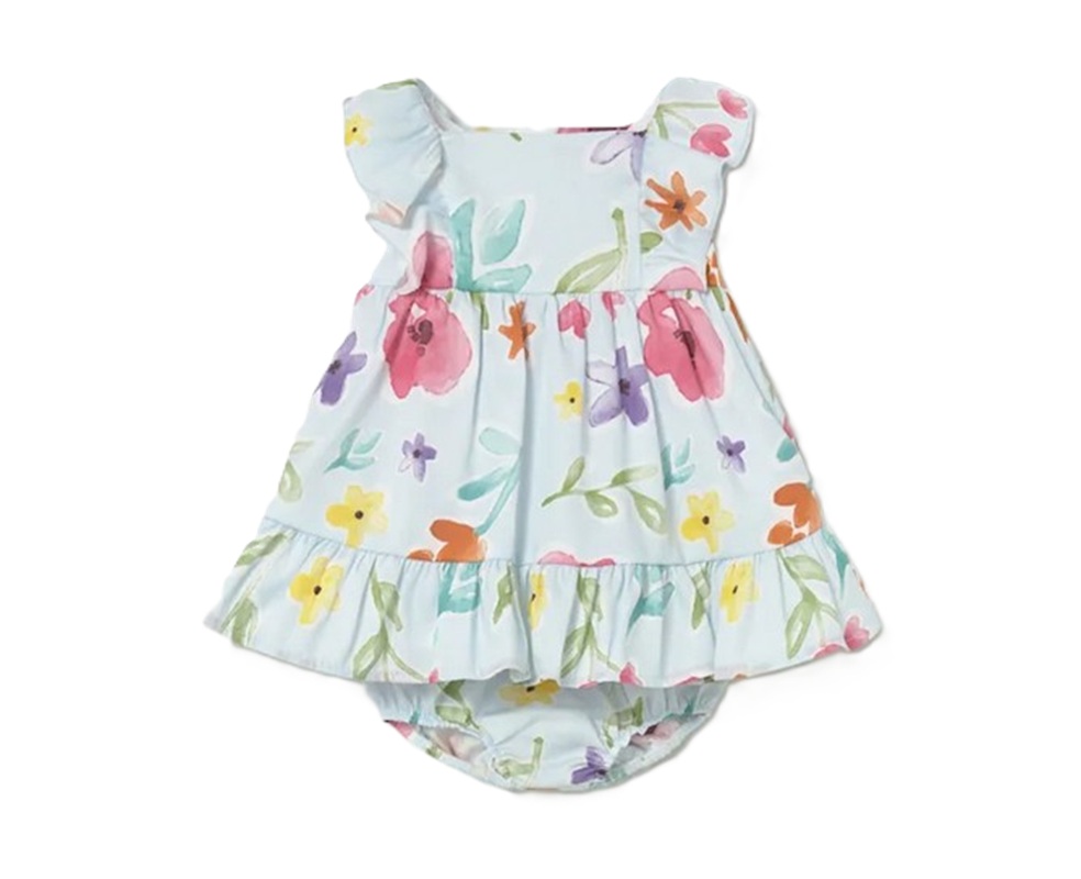 vestito svasato con maniche volant e stampa bimbe all over, coulotte in coordinato