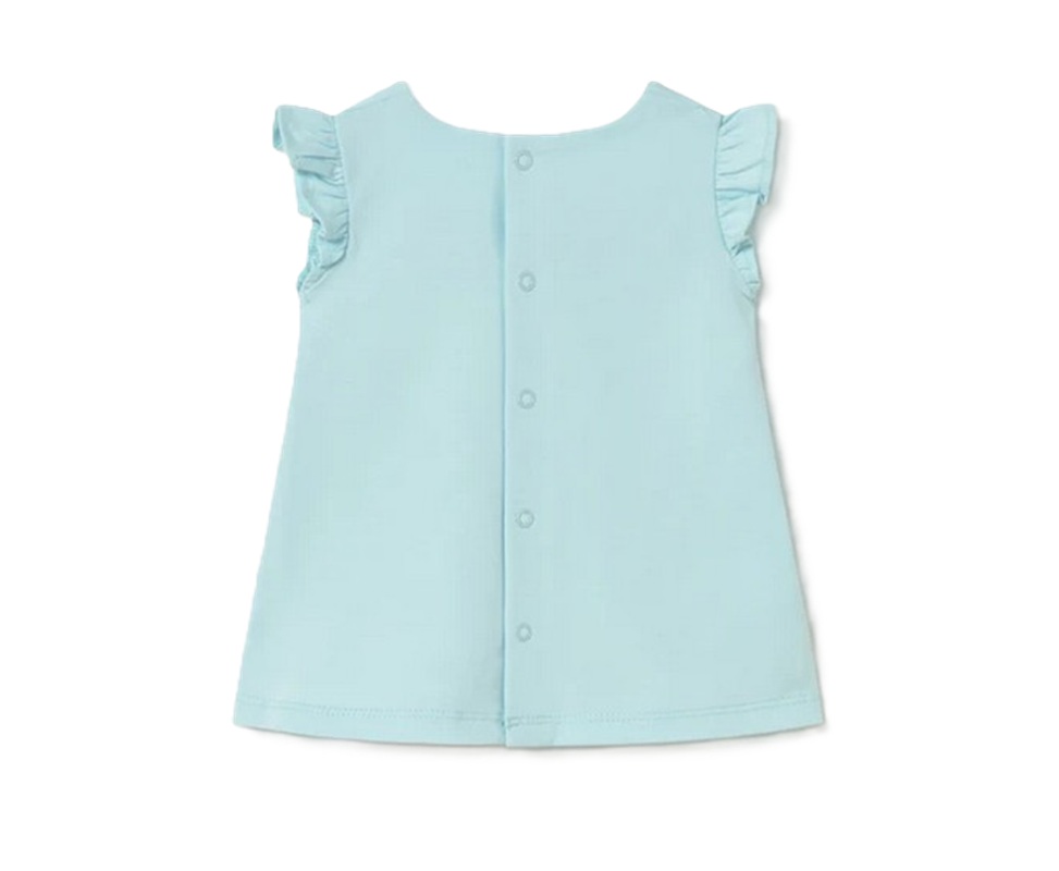 vestito smanicato con volant e stampa anteriore a contrasto