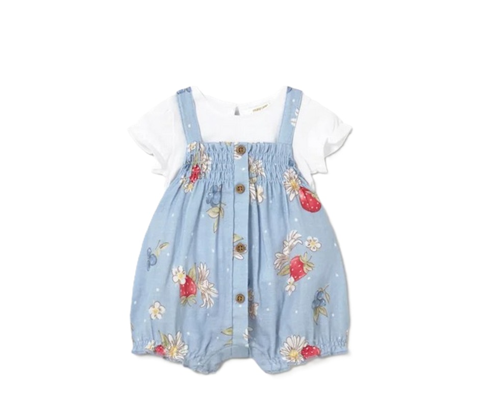 completo composto da t-shirt a manica corta tinta unita, salopette a fantasia fragole/margherite