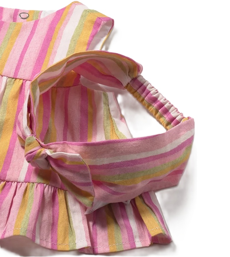 completo a righe composto da blusa svasata con profilo volant, coulotte in coordinato e fascia per capelli con fiocco