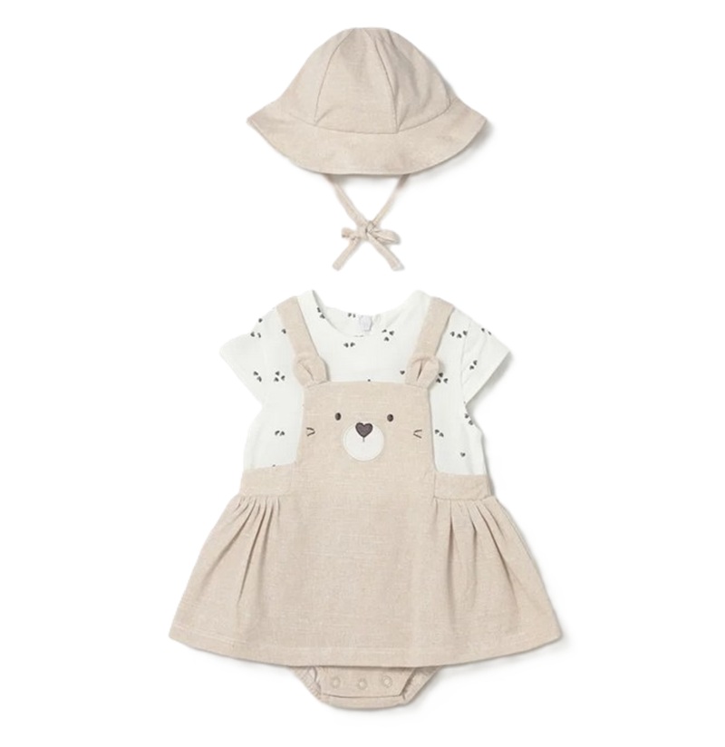 Completo 2 pezzi composto da: pagliaccetto finta salopette con ricamo e cappello in coordinato