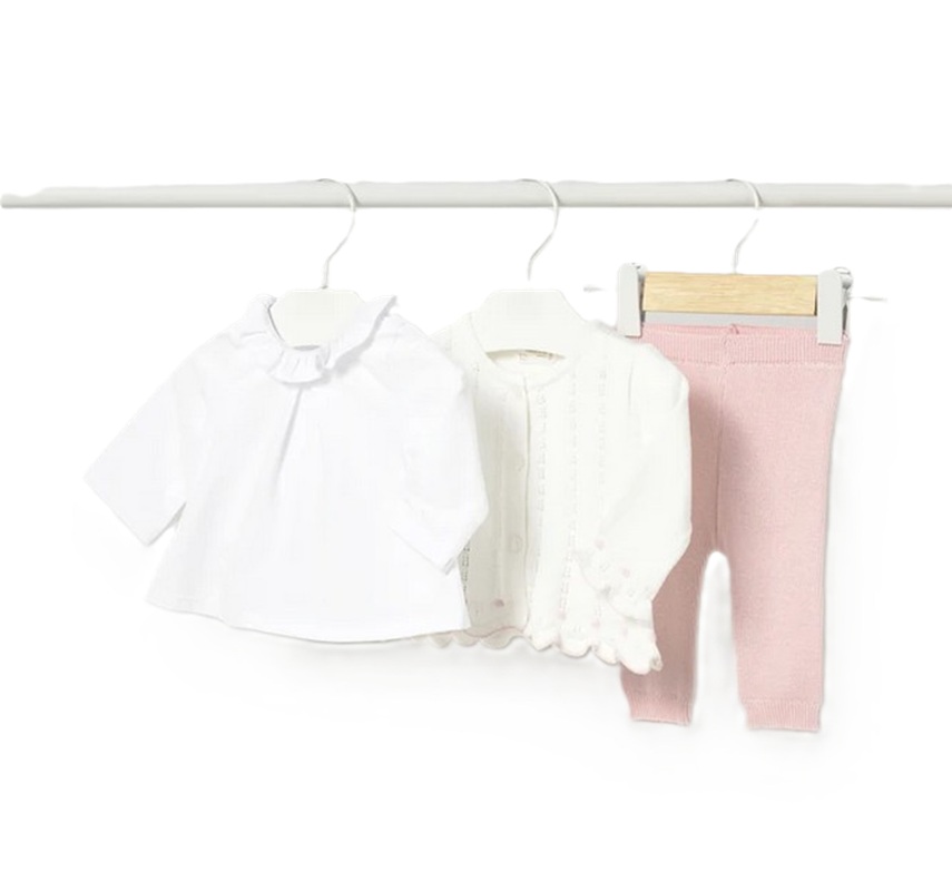 completo composto da cardigan bicolore in filo, t-shirt a manica lunga con colletto volant e pantalone in filo coordinato
