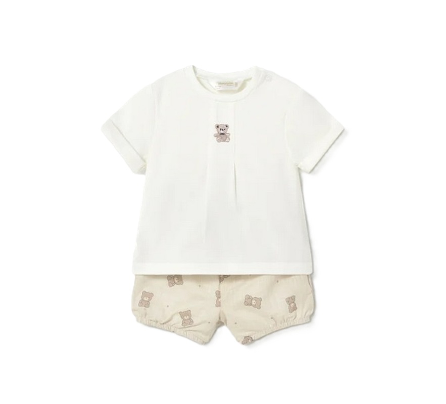 Completo 2 pezzi composto da: t-shirt manica corta con ricamo teddy e bermuda con stampa teddy all over
