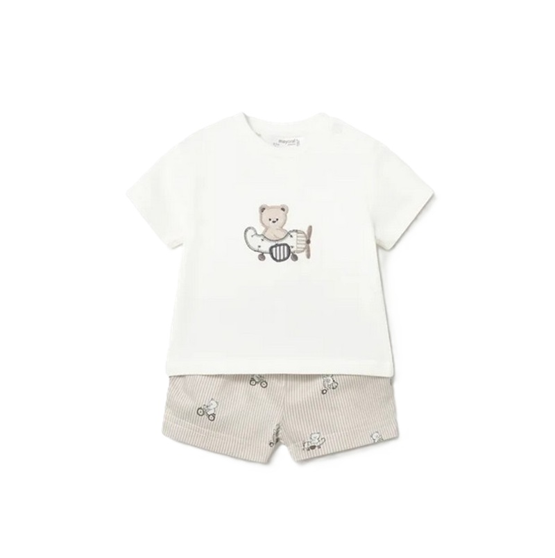 Completo 2 pezzi composto da: t-shirt manica corta con ricamo teddy e bermuda a righe con stampa teddy all over