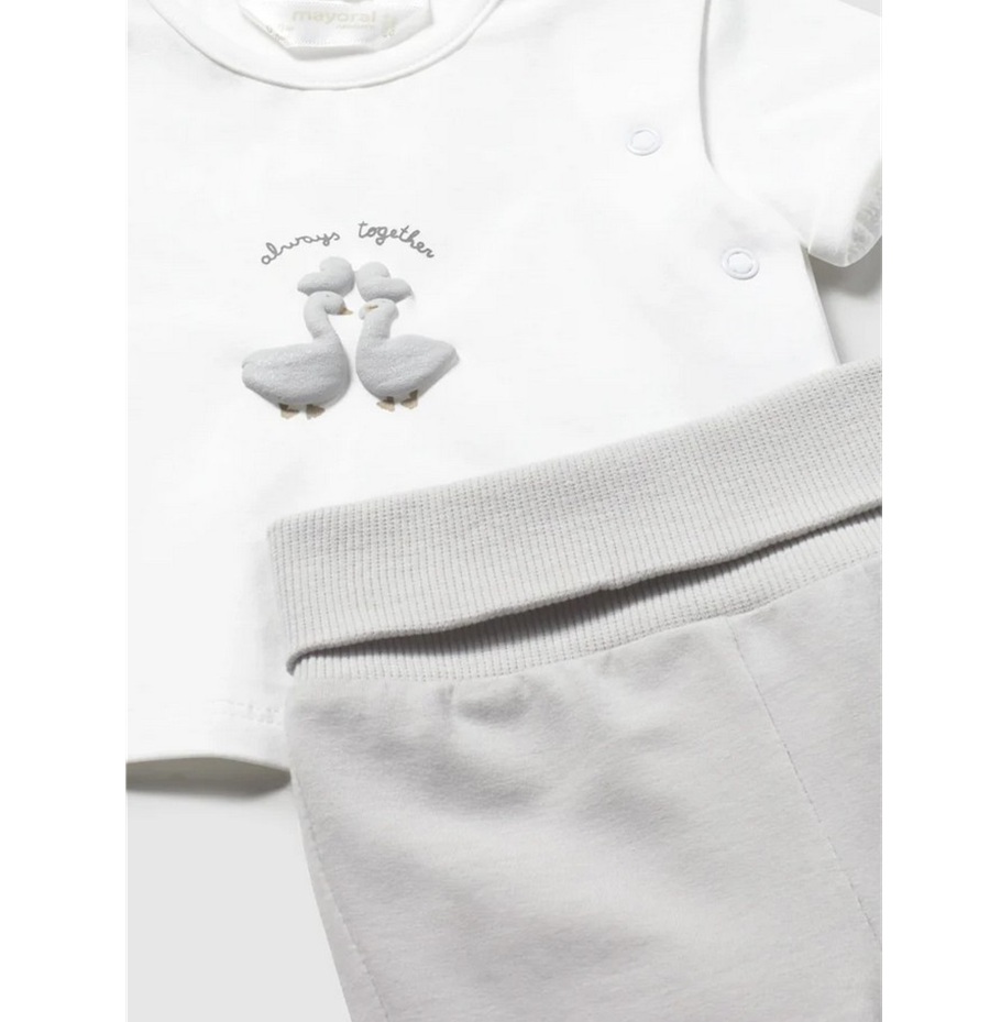 Completo 3 pezzi composto da: t-shirt manica corta con stampa, giacchino in felpa fantasia paperelle all over e chiusura bottoni clip, pantaloni tinta unita in coordinato