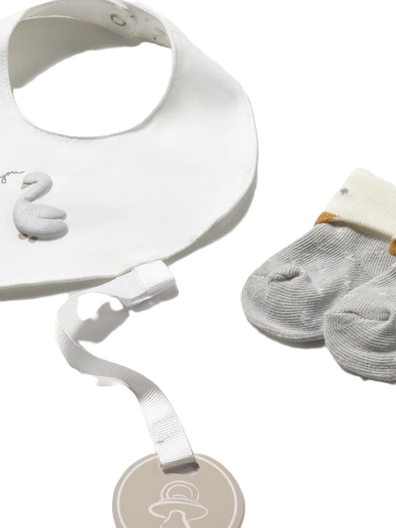 Completo 3 pezzi composto da: pagliaccetto microfantasia con taschino, bavetta con stampa e calzini in coordinato