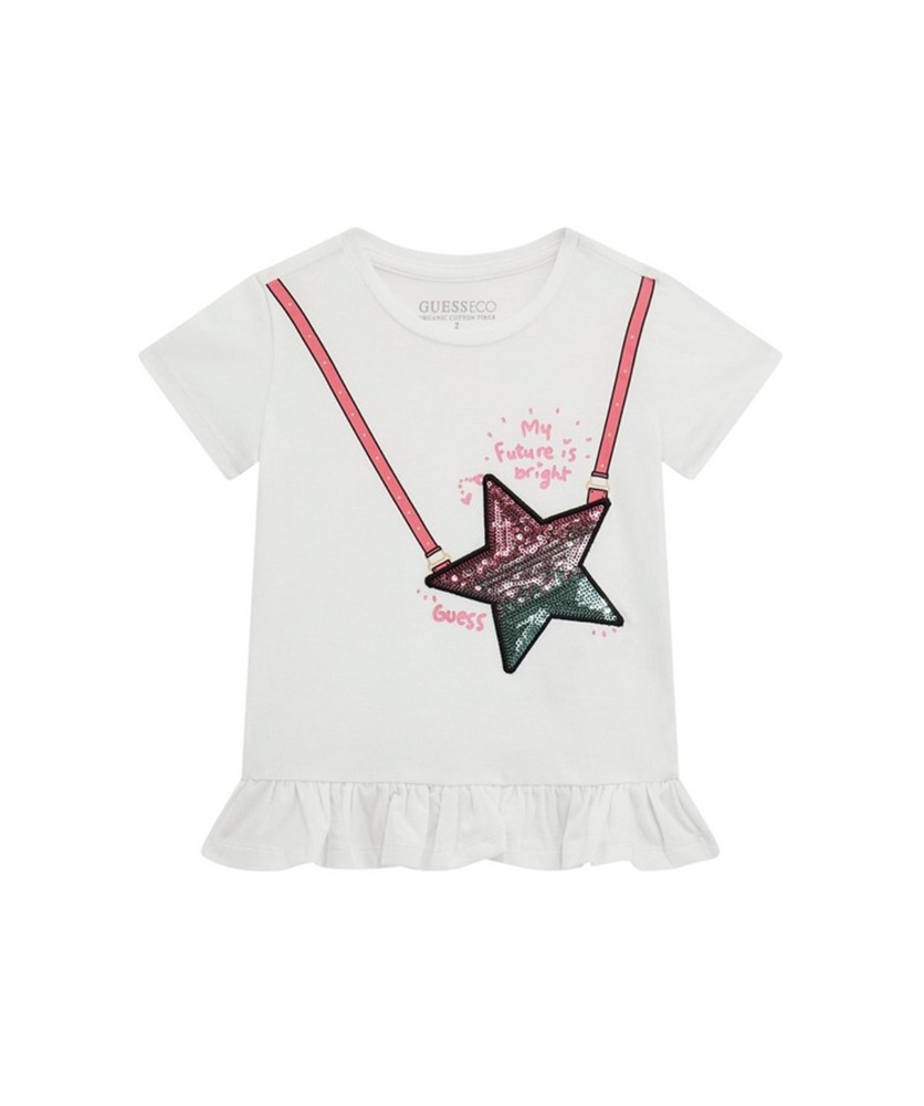 T-shirt manica corta con stampa e stella paillettes, balza su fondo