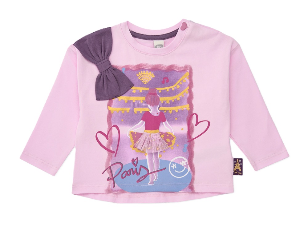 T-shirt manica lunga tinta unita con stampa ballerina e dettaglio tulle, applicazione fiocco