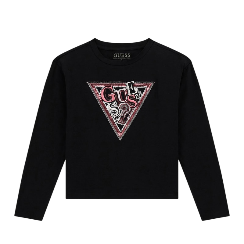 t-shirt a manica lunga in tinta unita con logo frontale in paillettes a contrasto colore
