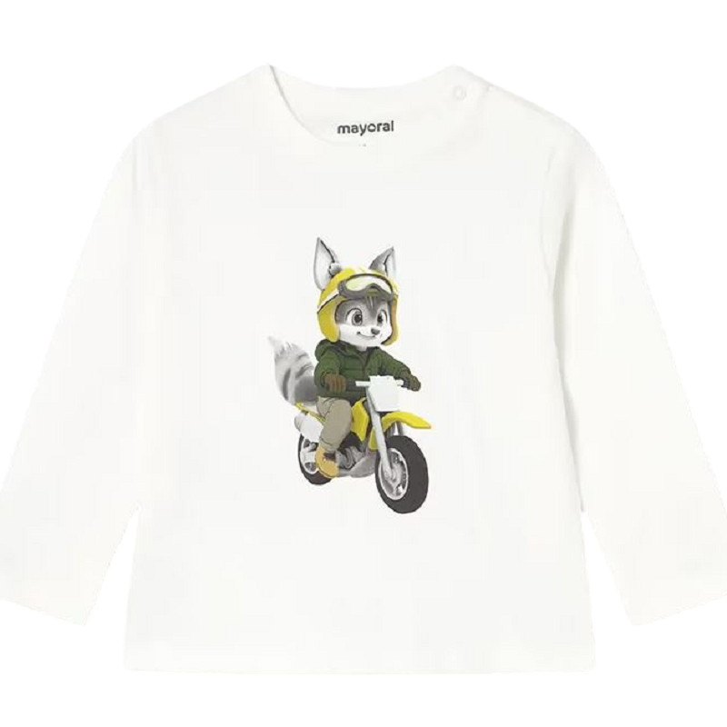t-shirt a manica lunga in tinta unita con stampa frontale gatto motociclista a contrasto colore