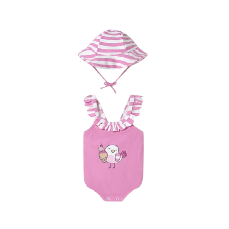 costume mare intero con stampa frontale sirenetta o pulcino, cappello in tinta unita o rigato coordinato