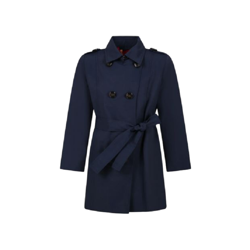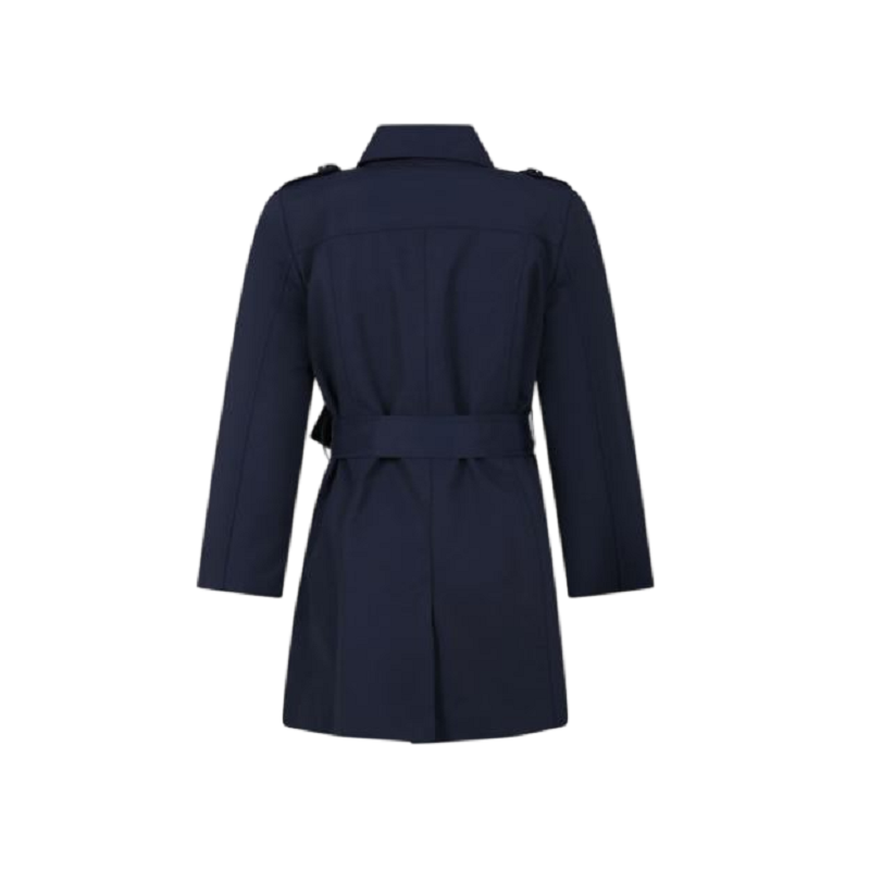 Trench blu in cotone, con maniche lunghe, colletto classico, chiusura con bottoni neri, tasche laterali. È decorato da chiusura con cintura.