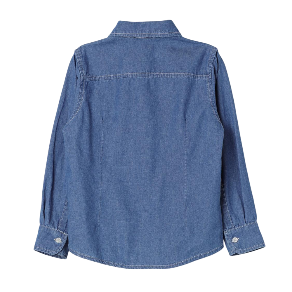 camicia in jeans con dettaglio ricamo logo multicolore sul davanti