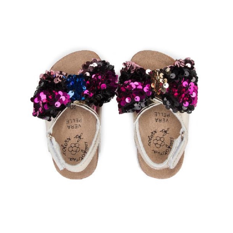 sandali con fasce incrociate, applicazione maxi fiocco in paillettes e braccialetto posteriore con strappo