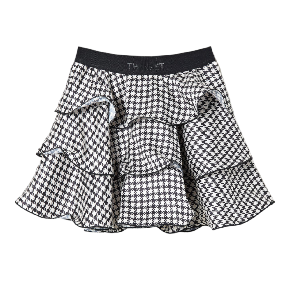 Gonna corta in raso pied-de-poule con balze arricciate, profili rifiniti da filo, elastico in gros-grain in vita