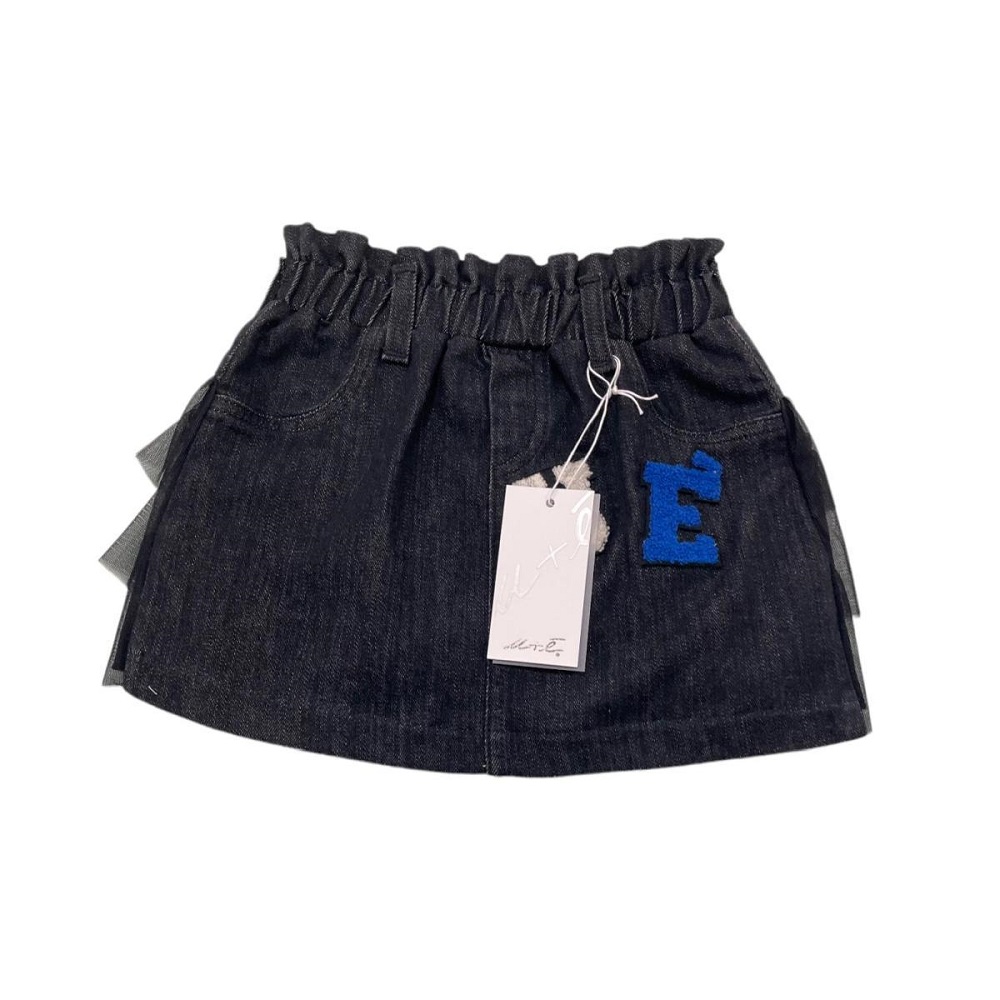 Gonna denim con logo frontale, balze in tulle posteriori, vita elasticizzata