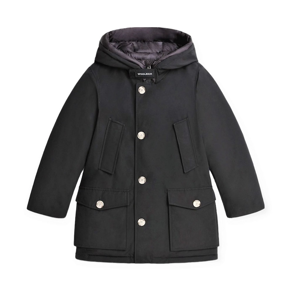Piumino con cappuccio, tasconi frontali con patta e bottone