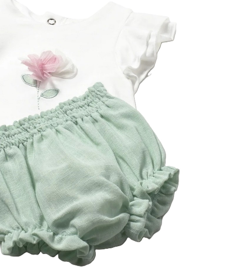 Completo composto da t-shirt maniche volant e ricamo fiore e coulotte tinta unita in coordinato