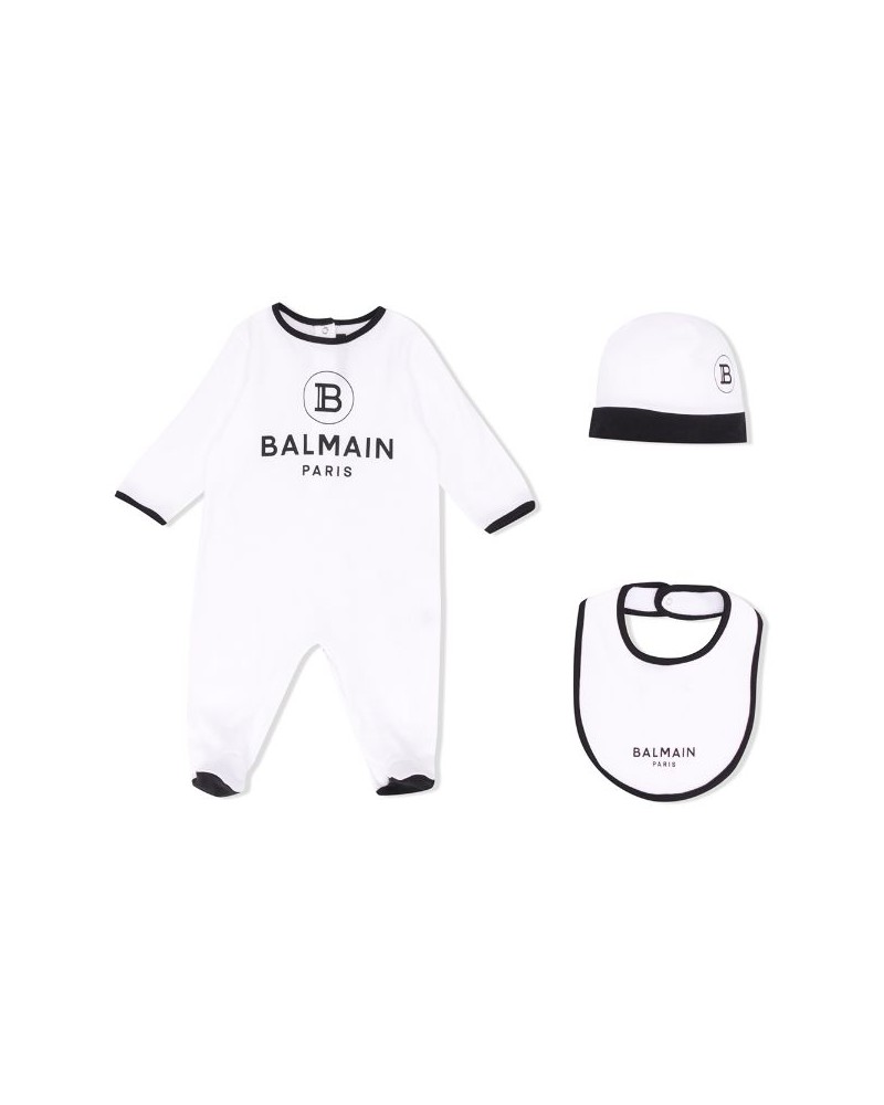 set composto da tutina con profili in contrasto e stampa marchio sul davanti, abbinata a cappellino logato e bavetta