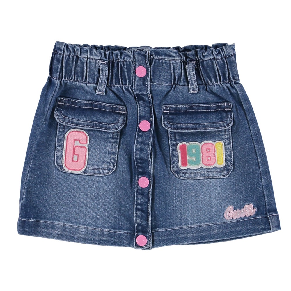 Gonna in denim, con coulotte nelle tg da neonata, chiusura frontale con bottoni automatici a contrasto,tasche con patta e ricami, ricamo logo sul fondo