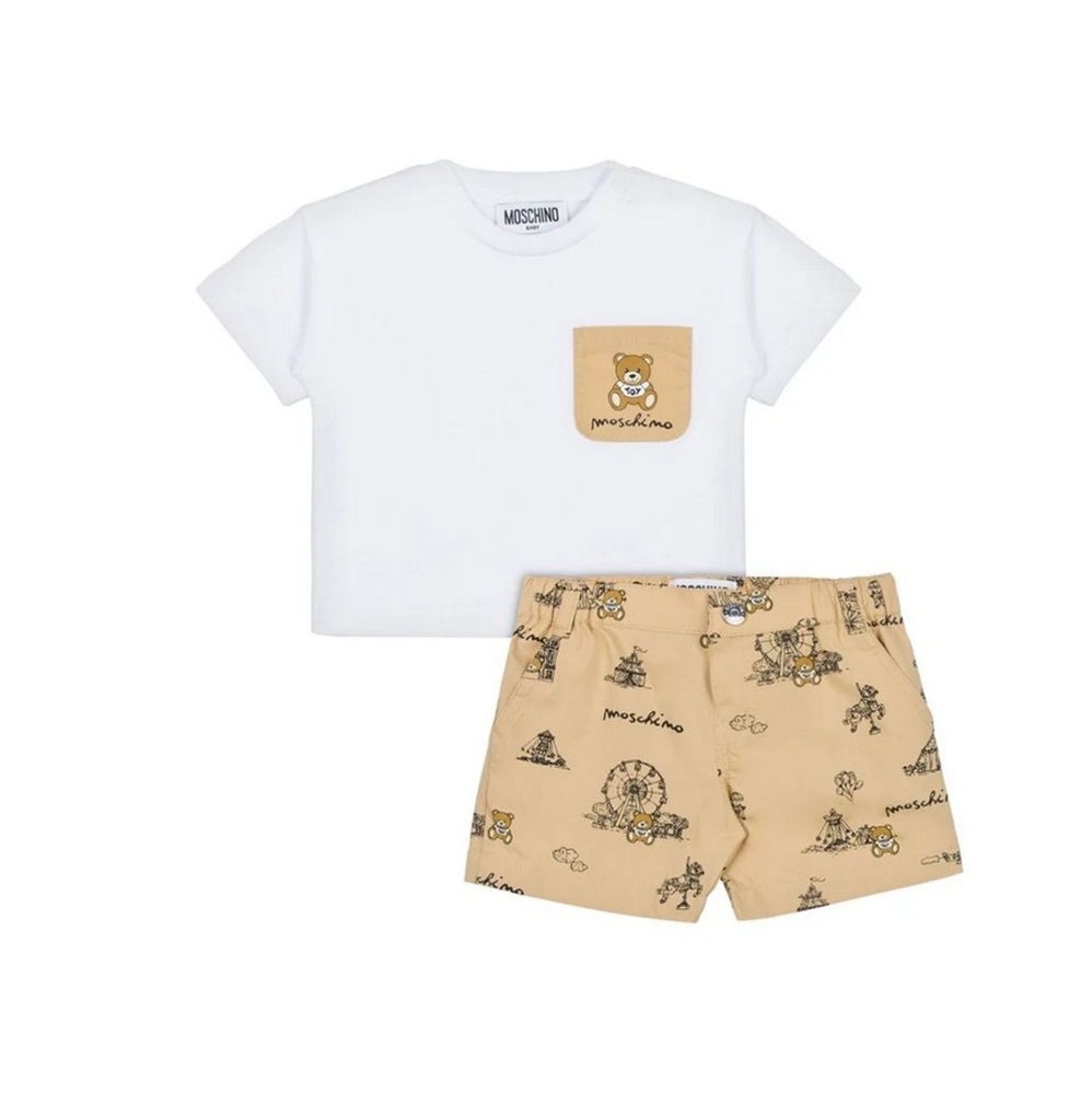 Completo 2 pezzi composto da: t-shirt manica corta con taschino a contrasto e stampa teddy e bermuda stampata con vita elasticizzata