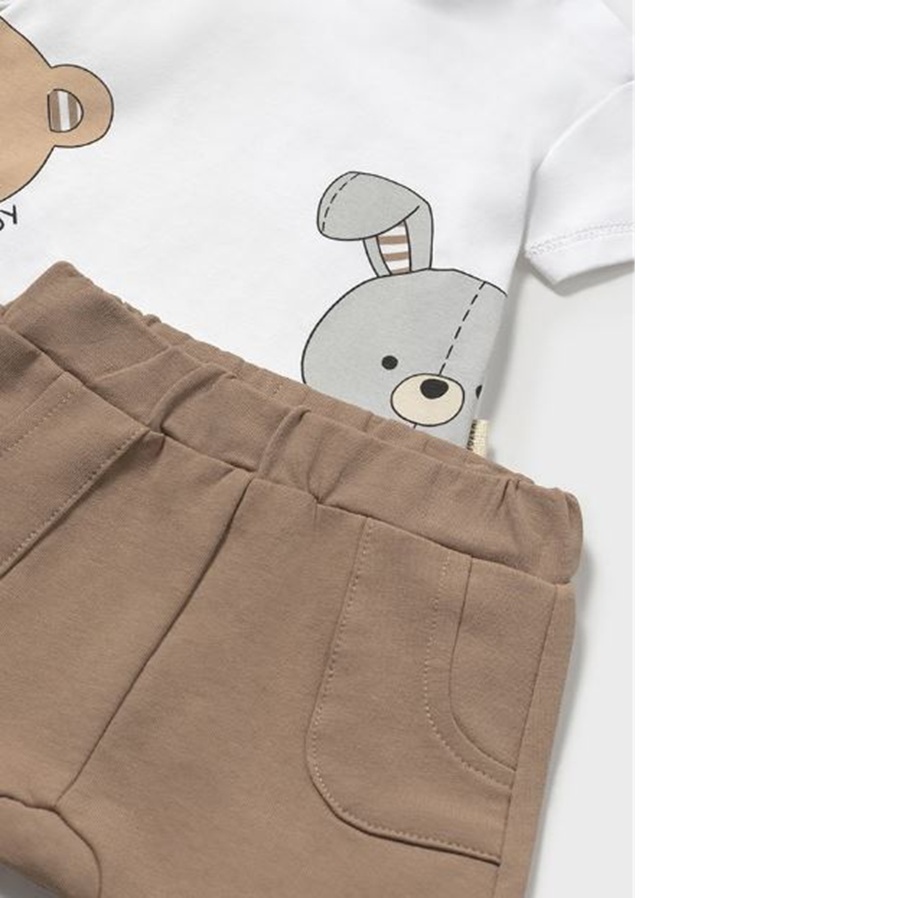 completo composto da t-shirt a manica corta con stampa orsetti a contrasto colore e bermuda in coordinato tinta unita con tasche