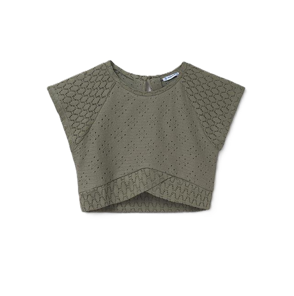 Top traforato tinta unita modello crop, chiusura posteriore con bottone