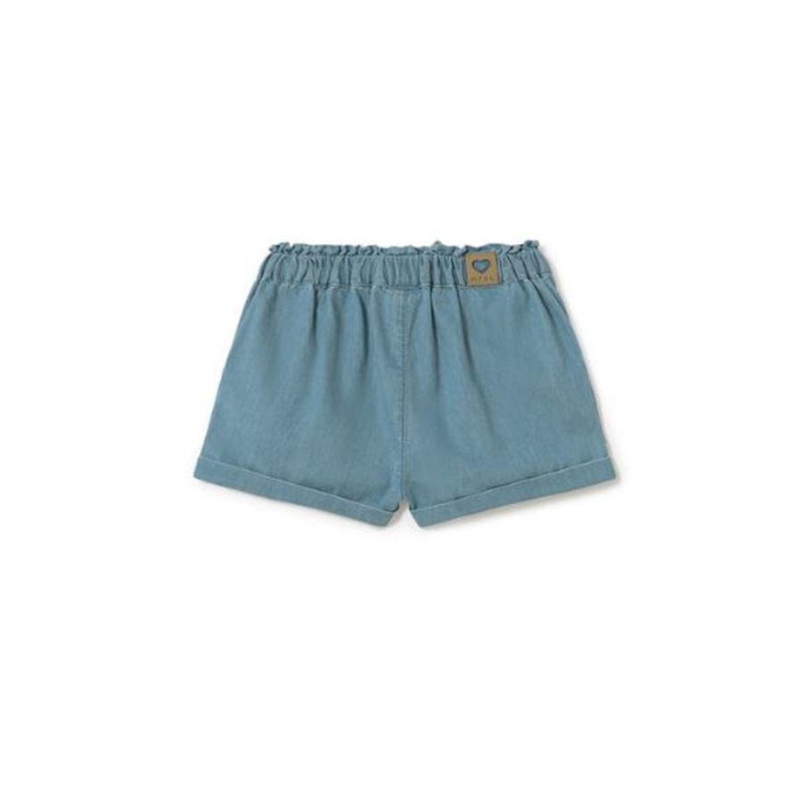 shorts in denim con elastico in vita e fiocco, tasche laterali e risvolto su fondo