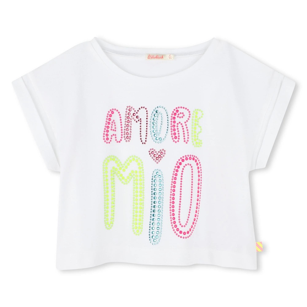 T-shirt manica corta tinta unita con scritta strass multicolore