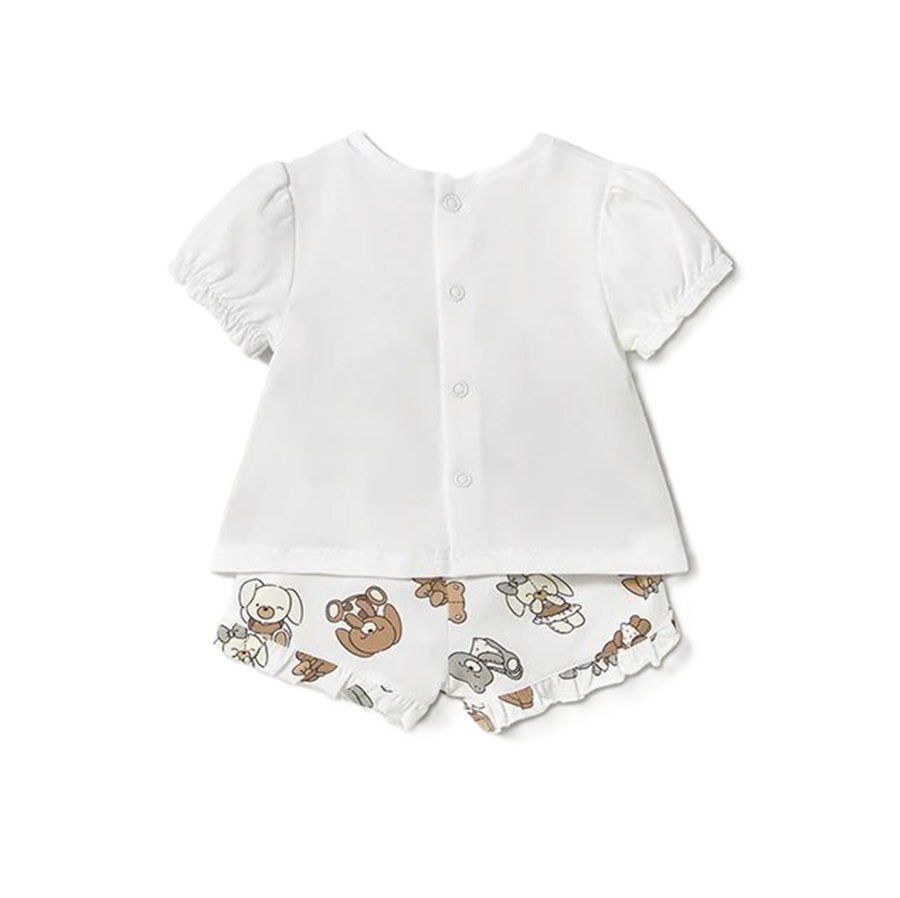 Completo composto da t-shirt svasata con mezze maniche a palloncino e stampe orsetti a contrasto colore, shorts a fantasia abbinato