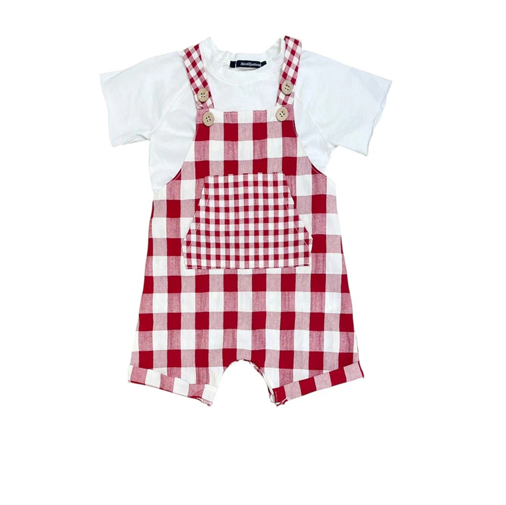 Salopette a quadretti con t-shirt manica corta tinta unita