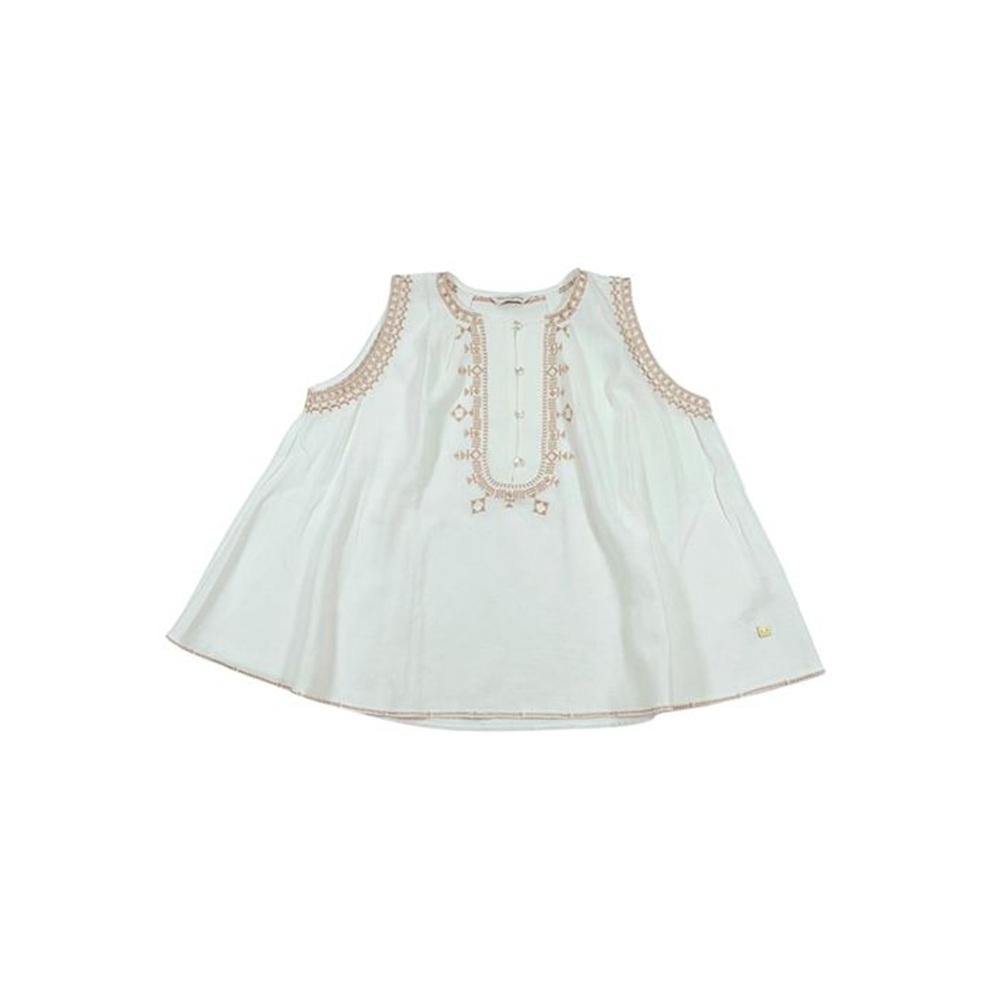 Canotta a campana, girocollo, dettaglio ricami a contrasto, chiusura con bottoncini a metà, applicazione logo in metallo, vestibilità ampia