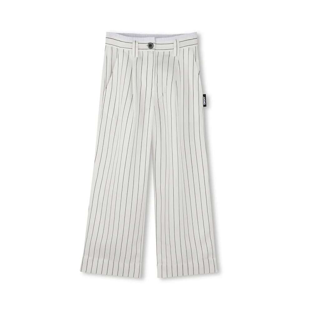 Pantaloni a righe con gamba dritta, fascia elastica in vita e tasche a filo, chiusura con zip e bottone