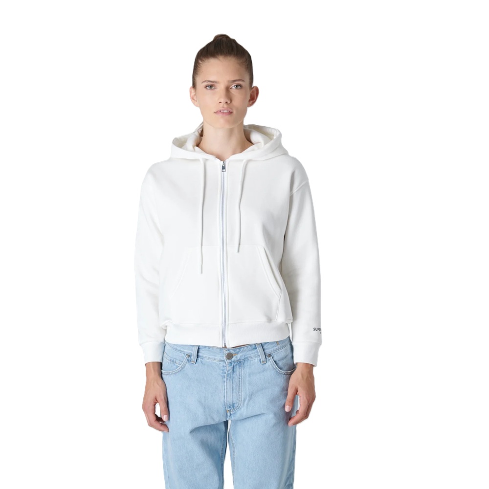 Felpa garzata in tinta unita con cappuccio e chiusura zip, tasche su fondo e logo a contrasto su manica