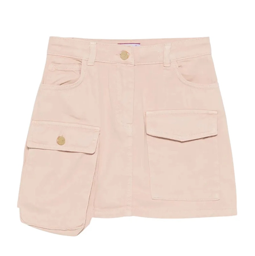 Gonna in denim tinta unita con tasconi, vita regolabile da coulisse interna, logo posteriore