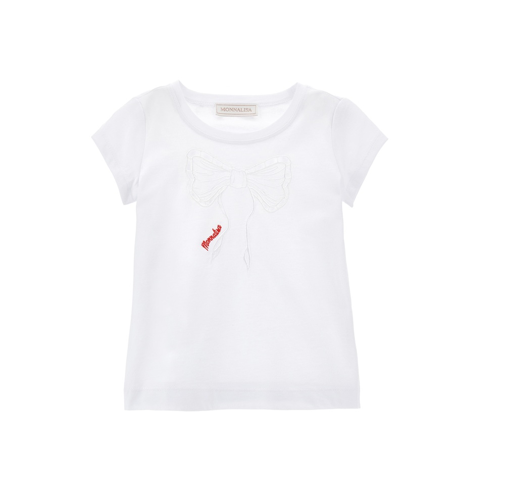 T-shirt manica corta tinta unita con ricamo fiocco sangallo, ricamo logo a contrasto