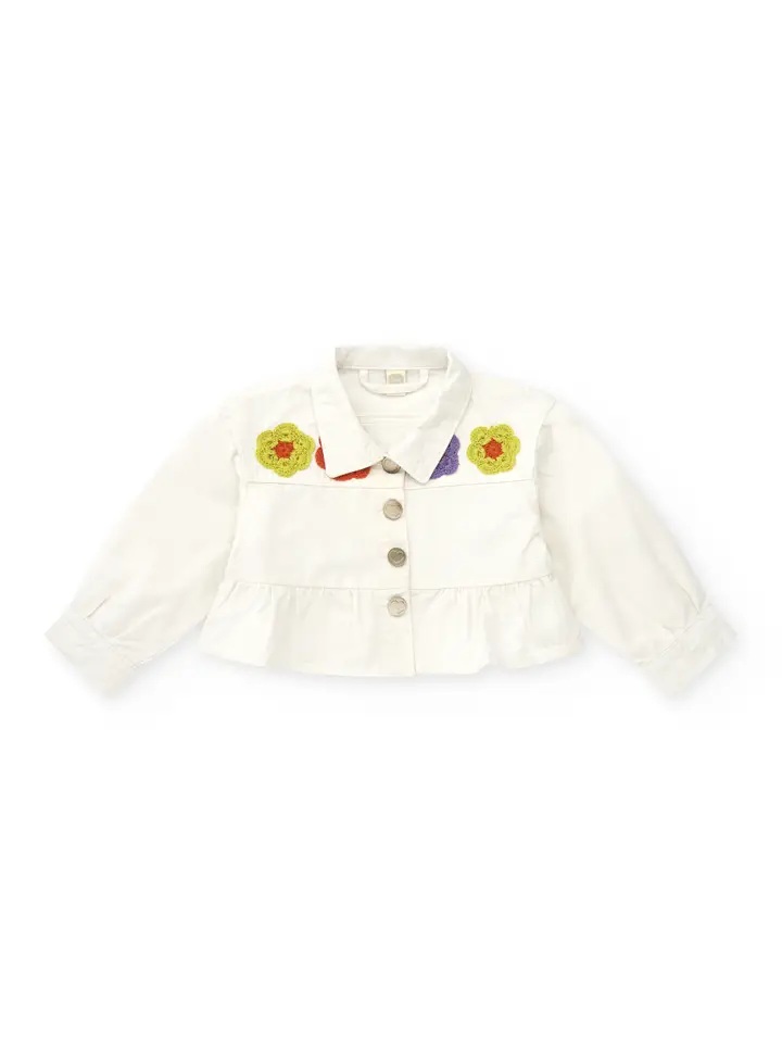 Giubbino tinta unita con ricamo fiori crochet a contrasto anteriori e chiusura con bottoni automatici