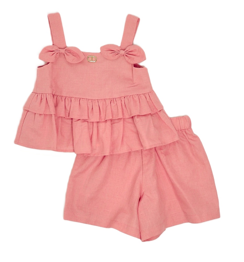 Completo tinta unita composto da: canotta con rouches impreziosita da fiocchi e dal logo Oval T placcato oro e pantaloncino con elastico in vita
