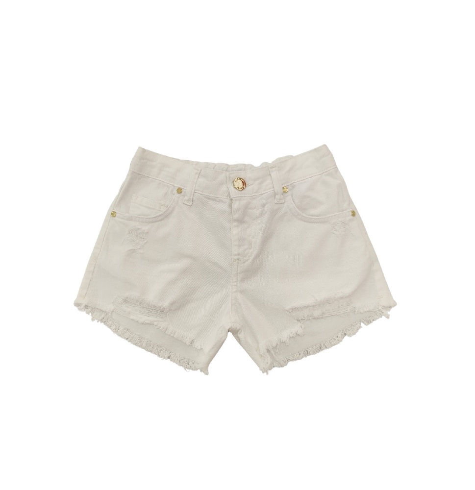 shorts in denim tinta unita con cinque tasche, strappi sul davanti e fondo sfrangiato