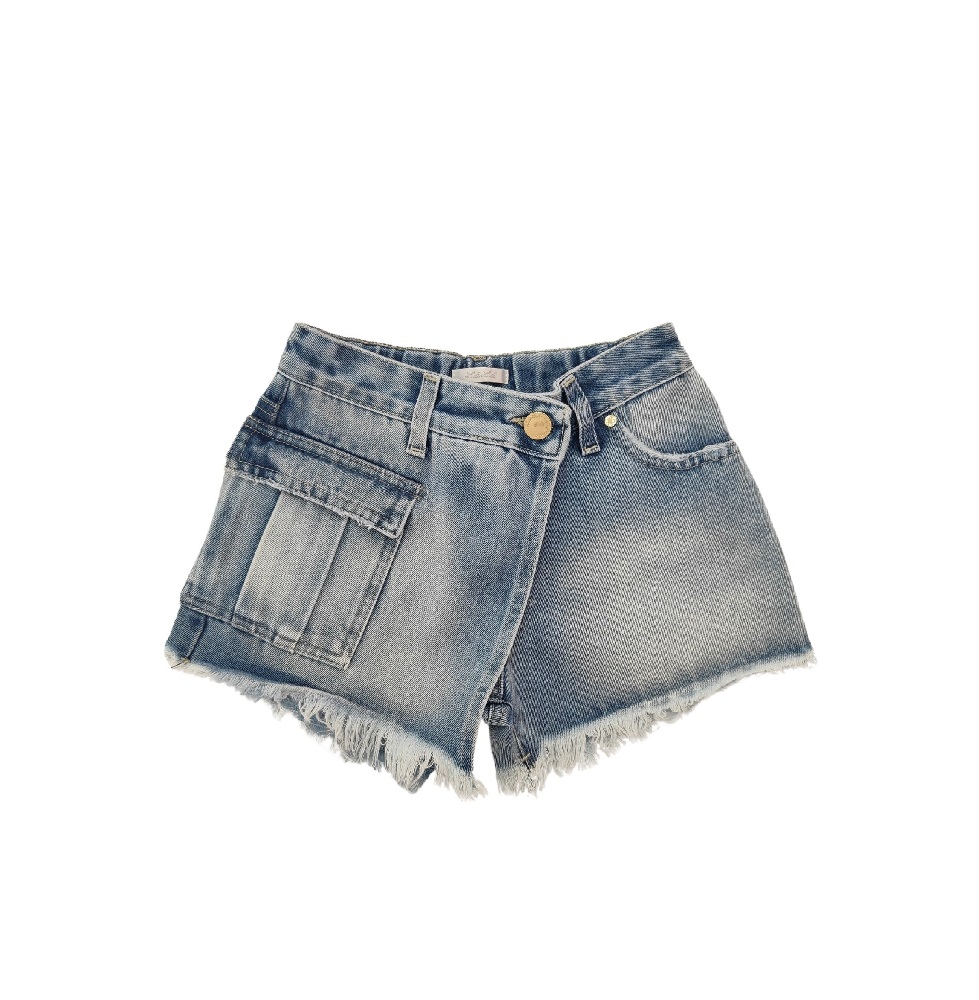 shorts in jeans modello portafoglio con dettaglio tasca patta, coulisse interna in vita e fondo sfrangiato