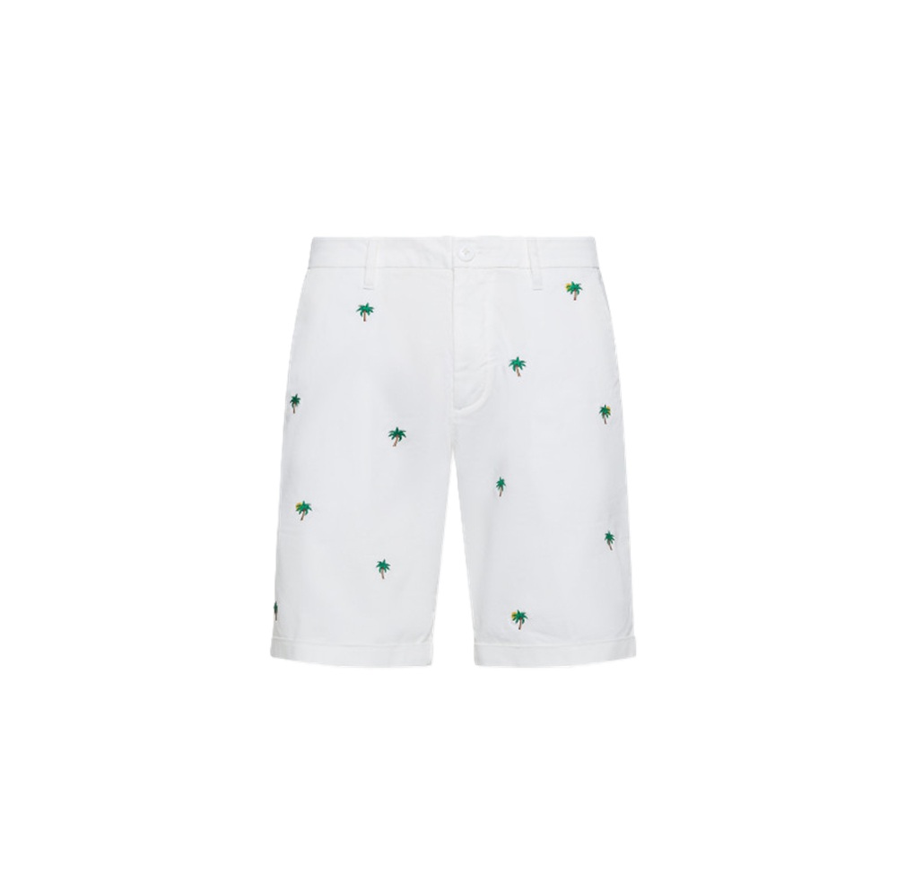 Bermuda tinta unita con ricamo palme/tucano all over a contrasto, tasche a filo anteriori e posteriori
