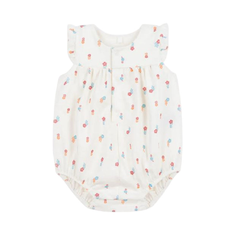 pagliaccetto a fantasia fiori , volant su giromanica e chiusura anteriore clips