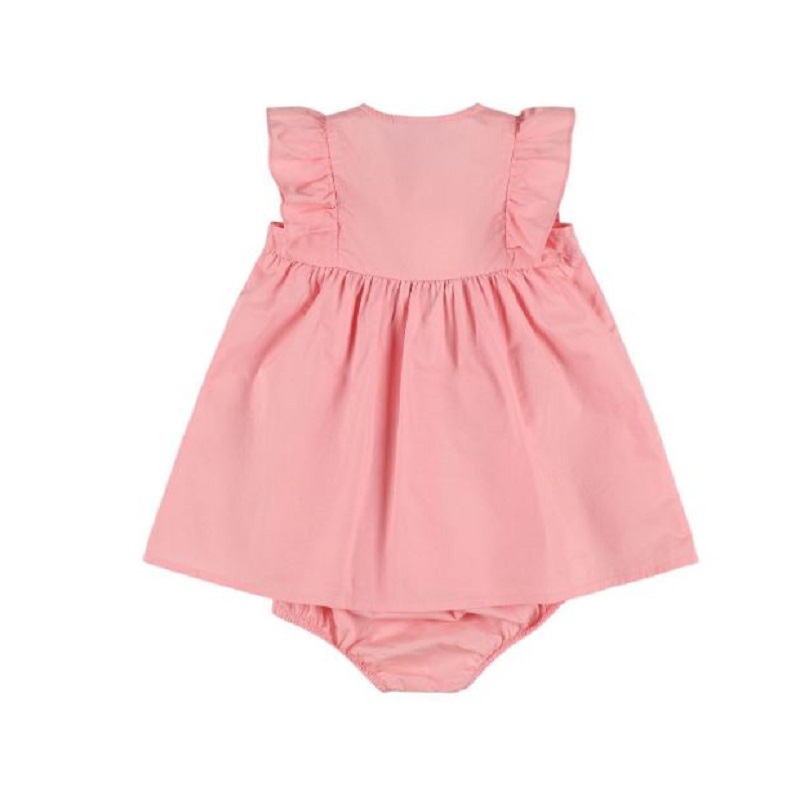 vestito scamiciato svasato con volant su giromanica, chiusura anteriore bottoni e coulotte in coordinato
