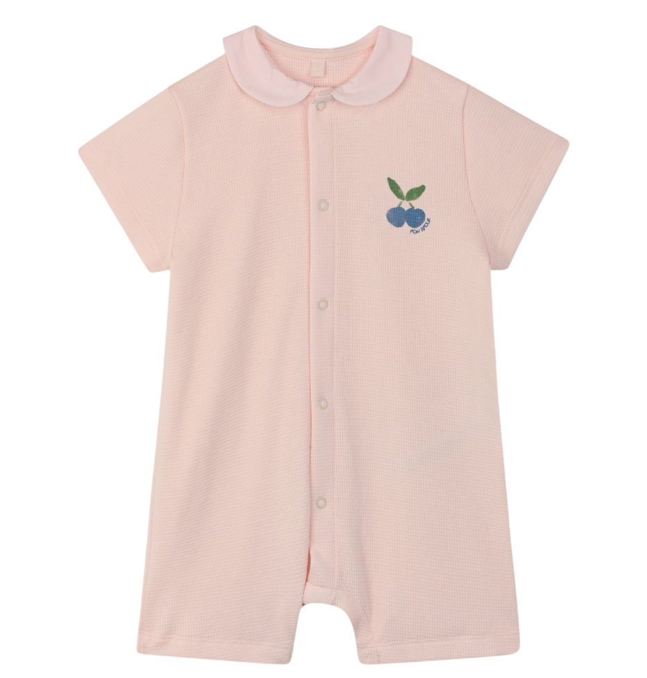 pagliaccetto in piquet tinta unita con colletto, stampa ciliegie contrasto sul davanti e chiusura anteriore clips