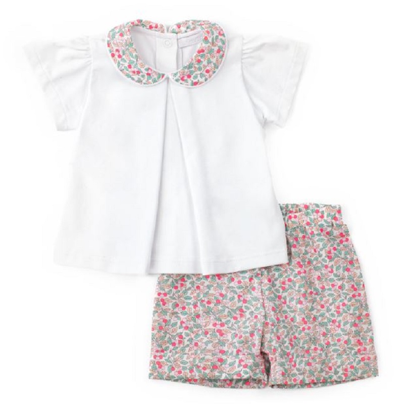 completo composto da t-shirt svasata in tinta unita con colletto a fantasia ciliegie, in richiamo dello shorts abbinato