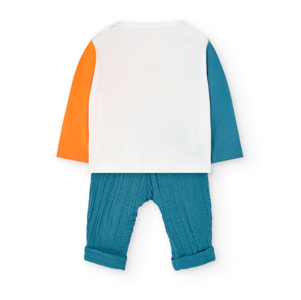 Completo 2 pezzi comosto da: t-shirt manica lunga con stampa a contrasto e pantalone in garza tinta unita