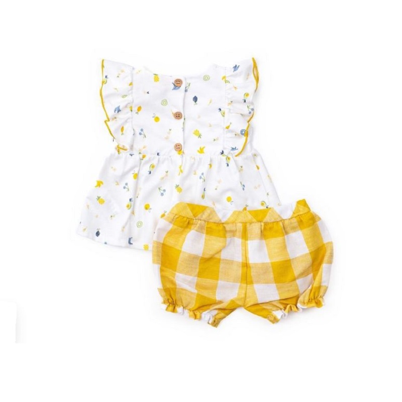 completo composto da blusa svasata a fantasia frutta, con volant su giromanica e coulotte a quadri abbinata