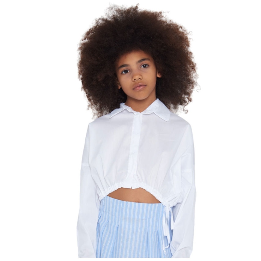 Camicia manica lunga tinta unita, modello cropped con lacci arricciabili ai fianchi, incrociata dietro